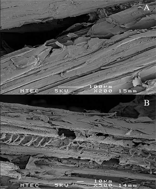 如圖3所示,將通過分離獲得的固相微結(jié)構(gòu)通過SEM與天然RH進(jìn)行了比較;钚蕴吭牧咸峁┝苏G彝暾谋砻妫砻髦参锊牧系母叨扔行虻耐暾Y(jié)構(gòu)(圖3A)。分離的固體殘余物的生物質(zhì)的表面結(jié)構(gòu)顯示出表面和內(nèi)部結(jié)構(gòu)的破壞,并具有空腔和裂紋。該觀察結(jié)果表明半纖維素的去除和表面木質(zhì)素的改變。對(duì)于BET表面積測(cè)量,分析了原始和預(yù)處理的生物量樣品。