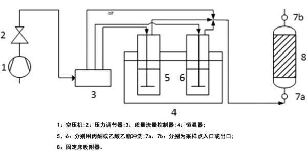 丙酮和乙酸乙酯蒸氣的混合物用作吸附物。圖1說明了實驗裝置的方案。將含有純化合物的沖洗液置于設(shè)定為15℃的恒溫器中。質(zhì)量流量控制器用于設(shè)置每個組分的流速。根據(jù)組分的蒸氣壓選擇流速,以使每種吸附物的初始濃度為100mg/L。氣流如下:丙酮:0.1L/min,乙酸乙酯:0.05L/min,和空氣:0.135L/min。將空氣與丙酮和乙酸乙酯蒸氣的混合物從下方引導(dǎo)至吸附床,并將10g吸附劑置于吸附器中。在吸附器的入口處采集氣體樣品以在此過程中每5分鐘測定一次吸附物和吸附器出口的初始濃度,以確定吸附物濃度的變化。這些測量是使用帶有火焰離子化檢測器進(jìn)行的,直到乙酸乙酯的出口濃度達(dá)到其初始濃度的90%。色譜分析參數(shù)如下:空氣流量:350mL/min,氫氣流量:35mL/min,尾吹氣流量(He):30mL/min,入口溫度:100℃,分流比:15。