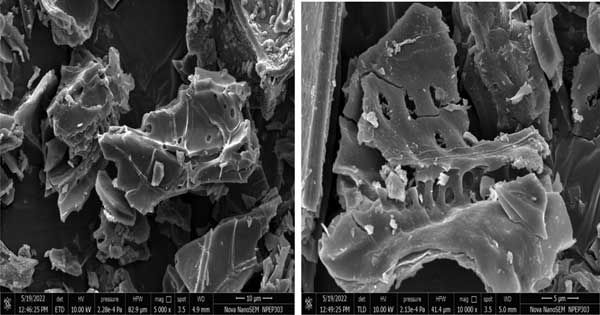 使用掃描電子顯微鏡分析獲得的活性炭的孔結(jié)構(gòu)。SEM設(shè)備具有超高分辨率低電壓成像和獨(dú)特的低真空能力。SEM圖像是在15kV時(shí)以1nm、1kV時(shí)1.4nm、3kV時(shí)1.8nm和30Pa的不同分辨率拍攝的。觀察活性炭的表面物理形態(tài)是通過使用SEM完成的技術(shù)。圖3顯示活性炭的SEM圖像。這表明活性炭的外表面具有均勻開放的大孔。此外,活性炭的表面是高度多孔的,其特點(diǎn)是不均勻。同樣清楚的是,活性炭在其外表面具有微孔和空腔,暗區(qū)位于該處。經(jīng)受碳化后,活性炭由于ZnCl2的蒸發(fā)而產(chǎn)生空隙(稱為氣孔)?梢詫⑦@些孔視為通向微孔網(wǎng)絡(luò)的通道。