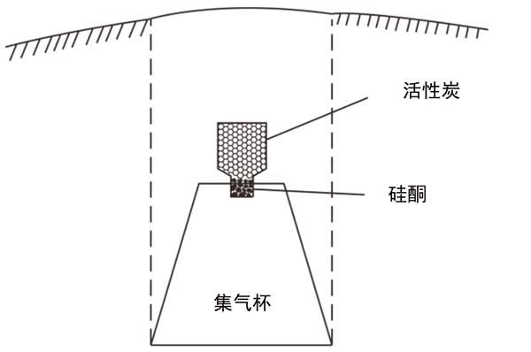 所用儀器為活性炭氡檢測儀。在現(xiàn)場調(diào)查中,將使用過的活性炭烘烤干燥。冷卻后,將活性炭按照適當(dāng)?shù)臉?biāo)準(zhǔn)放入取樣器中,用硅膠塞規(guī)避地下水分的影響,然后將樣品密封備用。接下來,將裝滿的采樣器口朝下放置在測試坑中,如圖1所示。采樣器和集氣杯穩(wěn)定固定,上面蓋上塑料布,密封坑口。當(dāng)埋杯到預(yù)設(shè)時(shí)間(至少5天)時(shí),取出采樣器,仔細(xì)填寫采樣時(shí)間和氣候。然后將采樣器放入經(jīng)過測試和校準(zhǔn)的活性炭氡氣檢測儀中,記錄每個(gè)采樣器的線數(shù)和點(diǎn)數(shù)。