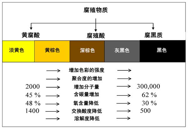 腐殖質(zhì)的性質(zhì)與其成分有非常密切的聯(lián)系,其成分受到腐殖化過(guò)程的影響,與分子(分子量)和顆粒的大小、分散程度(真溶液或膠體溶液)、極性(由這些決定)由骨架的性質(zhì)(芳香族;脂肪族)決定,主要是官能團(tuán)的類型、數(shù)量和解離能力。腐殖質(zhì)成分的功能在于其在水中的溶解度(黃腐酸的溶解度比腐植酸高,因此天然水中平均含有87%的黃腐酸)、聚集能力、解離能力(主要是羧基)官能團(tuán))和相關(guān)的電荷比(粒子的zeta電位)。腐殖質(zhì)的一些特性也受到水的成分及其pH值的影響。圖1顯示了腐殖質(zhì)的基本特性。