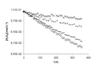 過(guò)氧化氫反應(yīng)在用于溫度控制的雙壁玻璃池中進(jìn)行。隨后用差壓傳感器進(jìn)行氣壓測(cè)量。為了計(jì)算作為時(shí)間函數(shù)產(chǎn)生的分子氧的量,對(duì)壓力數(shù)據(jù)進(jìn)行校正,以考慮氣體的水蒸汽壓力,氧氣溶解度和亨利常數(shù)作為溫度的函數(shù)。