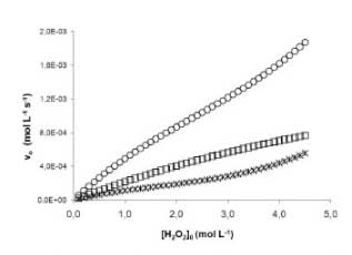 在圖3中關(guān)系決定于過(guò)氧化氫的初始濃度的反應(yīng)初速度的變化,當(dāng)活性炭(CAT)的質(zhì)量-體積是比:(1)1.0×10 -3克毫升- 1,(b)2.0×10 -3 g mL -1和(c)4.0×10 -3 g mL -1,溫度為298 K.