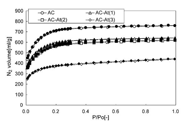 圖1.酸處理的活性炭的N2吸附/解吸等溫線:開放:吸附,閉合:解吸。