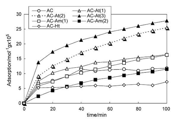 實(shí)驗(yàn)條件:在N2中使用210ppm的甲硫醇作為甲硫醇?xì)怏w;钚蕴康闹苽,活性炭通過(guò)碳化隨后活化制備。用蒸汽進(jìn)行活化。用HNO3/H2SO4溶液進(jìn)行活性炭的酸處理。將1克活性炭在100立方厘米HNO3/H2SO4溶液中在室溫下攪拌0.5小時(shí)。過(guò)濾分離經(jīng)過(guò)處理的活性炭,并在超聲條件下用去離子水洗滌數(shù)次,直到水的pH值達(dá)到5以上。然后將活性炭在100℃空氣中干燥12小時(shí),在150℃下真空干燥1小時(shí)。用HNO3,HNO3/H2SO4(1/1比例)和HNO3/H2SO4(1/3比率)處理的活性炭分別表示為AC-At(1.2.3)。胺化合物對(duì)活性炭的改性通過(guò)十六胺的吸附來(lái)進(jìn)行。將活性炭浸入十六烷胺/乙醇溶液中并在室溫下攪拌30分鐘。然后過(guò)濾分離活性炭并在室溫下真空干燥2小時(shí)。由4×10-6和3.3×10-5摩爾m-3十六胺溶液制備的活性炭分別表示為AC-Am(1.2)。活性炭(AC-Ht)的熱處理在Ar氣氛中在600℃下進(jìn)行2小時(shí)。