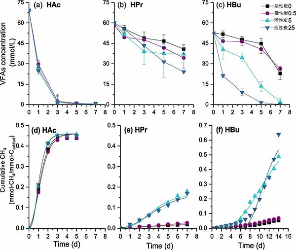 圖2。使用不同劑量的活性炭降解5g/L VFA(a-c)和相應(yīng)的甲烷生產(chǎn)(eh)。