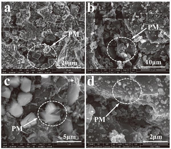 圖5顯示了粘附顆粒物質(zhì)后活性炭的形態(tài),其中可以發(fā)現(xiàn)許多顆粒分布在活性炭的孔隙或表面上。圖5(a)-5(c)中示出了分布在孔隙尺寸約20顆粒 μ米,5-10 μm和1 μ米。圖5(d)示出了分布式活性炭的表面上的顆粒,其直徑幾乎小于1 μ微米。圖6給出了分布在孔隙中的顆粒的SEM映射,表明大量顆粒富含K,并且它們主要以氯化物或硫酸鹽的形式存在。這些顆粒的出現(xiàn)對應(yīng)于PM 2.5中K和Cl含量的降低。
