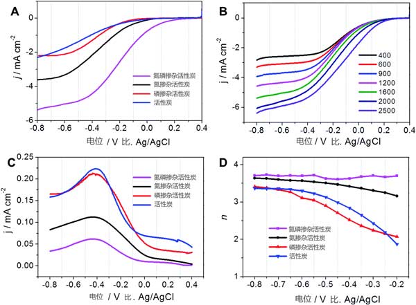 活性炭樣品通過(guò)兩步法制備,包括原位氧化聚合和高溫?zé)峤。這里,苯胺和植酸分別用作氮源和磷源。為了研究氮磷碳比對(duì)活性炭的氧化還原電催化活性的影響,在中性介質(zhì)中進(jìn)行循環(huán)伏安圖。旋轉(zhuǎn)圓盤(pán)電極伏安圖在氧飽和的50mM磷酸鹽緩沖溶液中進(jìn)行,結(jié)果顯示在圖2A中。在摻雜碳改性后,活性炭基催化劑的起始電位顯示出從0V到+0.22V的大的正向偏移,氧化還原電流密度也大大增加。此外,由共摻雜碳改性的活性炭電催化活性?xún)?yōu)于由單摻雜碳改性的活性炭電催化活性。在進(jìn)行旋轉(zhuǎn)環(huán)盤(pán)電極測(cè)量以研究不同催化劑的過(guò)氧化氫的產(chǎn)生(圖2C)。正如預(yù)期的那樣,氮磷摻雜活性炭顯示出比其他催化劑更低的過(guò)氧化氫產(chǎn)生?梢钥闯,氮磷摻雜活性炭在氧化還原起始電位和高電流電流方面對(duì)氧化還原具有優(yōu)異的電催化活性,突出了N,P共摻雜和中孔結(jié)構(gòu)對(duì)氧化還原的重要性。
