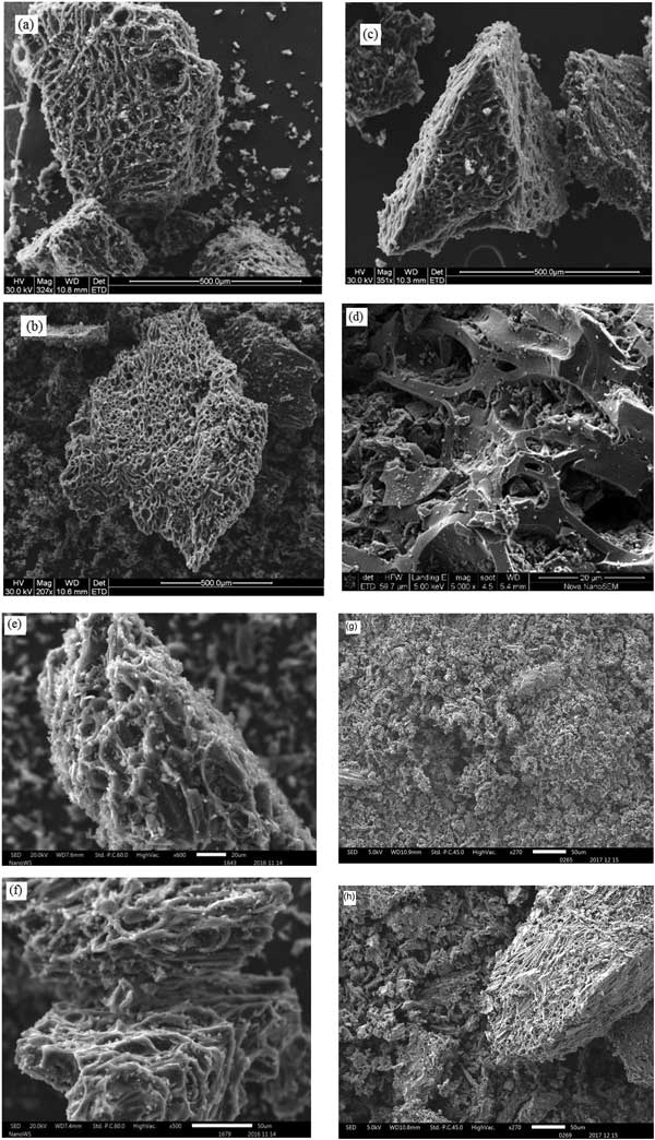 掃描電子顯微鏡圖像顯示在圖1a-h中。活性炭的磷酸處理導(dǎo)致具有可見孔隙率的材料(圖1a-c)。然而,仔細(xì)觀察后,孔隙結(jié)構(gòu)和尺寸是不同的。20%濃度改性后的活性炭具有稍微細(xì)長(zhǎng)的孔,40%表現(xiàn)出均勻的圓形孔,而60%顯示出細(xì)長(zhǎng)和圓形毛孔的混合。這些觀察結(jié)果表明,不同濃度的磷酸活化的活性炭具有不同的物理屬性。在這種情況下,磷酸是活化劑,并且在加熱時(shí)產(chǎn)生孔道,因?yàn)樗鼜奶贾幸莩,從而帶走一些萃取劑。圖1d描繪了具有小孔的粗糙紋理,圖1e顯示了類似巢的類型的孔,圖1f顯示了孔的破壞和變寬?捉Y(jié)構(gòu)和孔體積的變化可歸因于活化劑的強(qiáng)度增加。濃度較高的硝酸會(huì)破壞表面基團(tuán)。因此,需要使用最佳濃度的活化劑來(lái)防止損害吸附劑的表面特性。濃度太高可能導(dǎo)致結(jié)合官能團(tuán)的提取,使吸附劑吸附性差。