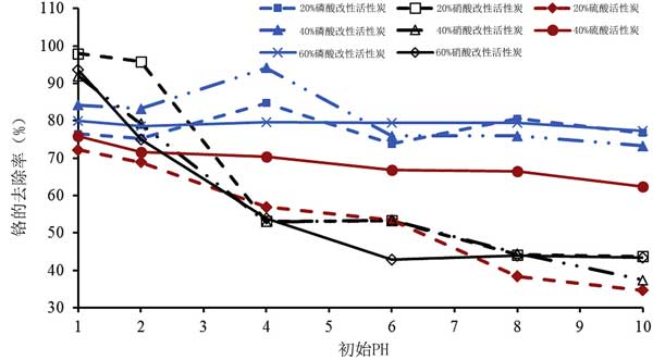 對(duì)鉻實(shí)現(xiàn)有效吸附所需的較高劑量可能意味著用硝酸,硫酸對(duì)活性炭進(jìn)行化學(xué)氧化和磷酸除去吸附位點(diǎn)。具體地,當(dāng)考慮所用的劑量和初始濃度時(shí),硫酸和磷酸改性產(chǎn)生的活性炭與沒改性的相比具有較差的性能。因此,基于使用不同前體的研究,不能推廣酸改性對(duì)活性炭性能的影響。對(duì)于不同濃度硫酸磷酸改性和20%硝酸改性活性炭,在pH 1下各種吸附劑的處理能力都超過75%最大的硝酸改性活性炭達(dá)到了98%,而磷酸改性活性炭的那些性能最大?偟膩(lái)說,20%硝酸改性的活性炭才是去除鉻的最佳吸附劑。