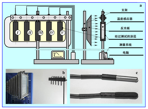 圖1:用紅外輻射測(cè)量被測(cè)涂層的加熱和冷卻時(shí)間。(a)測(cè)量站的示意圖,(b)反射鏡和支架的視圖,(c)不帶涂層和帶涂層的溫度傳感器。