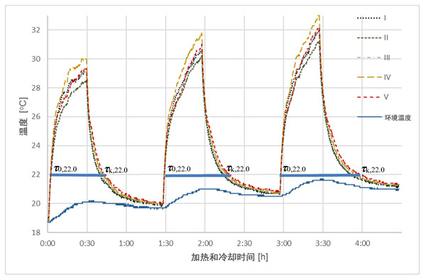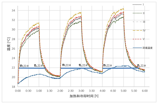 在分析曲線如圖2,圖3和圖4中,并收集結(jié)果,在一個(gè)溫度(22℃)中選擇,清楚地表明不同相變材料的影響活性炭中的量上的周期時(shí)間長(zhǎng)度與發(fā)生個(gè)體樣品中的熱交換過程。相對(duì)于溫度傳感器的更高的質(zhì)量和熱容量,即使吸附的相變材料的量很小,也可以看到處理時(shí)間的差異。當(dāng)與參比樣品(I),沒有相變材料,總的冷卻和加熱時(shí)間的所有樣品與相變材料的不同水平長(zhǎng)。對(duì)于樣品V,此時(shí)間延長(zhǎng)了7.5%,對(duì)于樣品IV,延長(zhǎng)了5.2%,對(duì)于III,延長(zhǎng)了2.4%,對(duì)于樣品II(未活化的活性炭),僅延長(zhǎng)了0.2%。
