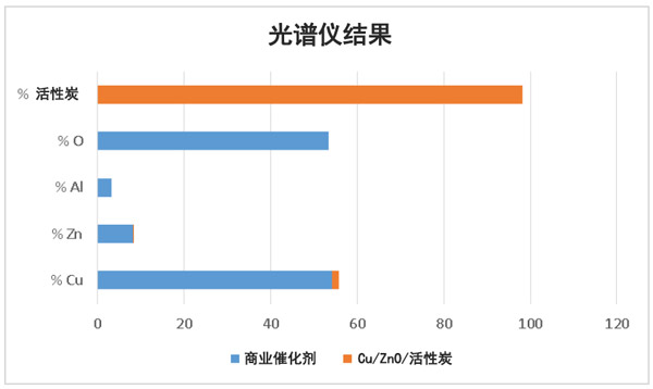 活性炭催化劑的制備,采用浸漬法制備了Cu/ZnO/活性炭催化劑。硝酸銅和硝酸鋅是將附著在活性碳上的銅和氧化鋅載體的原材料。Zn起促進劑的作用,以防止Cu的燒結。銅將在催化劑上被氧化并寫為銅[Zn]。之后,來自CuO分子將為CuO/ZnO相的形式。其還原將受到ZnO的影響。制備活性炭催化劑后,然后通過XRF,XRD,SEM和BET表面積分析儀對催化劑進行表征。商業(yè)催化劑和Cu/ZnO/活性炭催化劑的XRF分析見圖2。