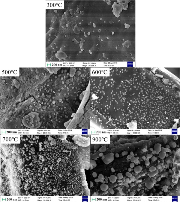 圖1:在不同溫度下生產(chǎn)的活性炭掃描電子顯微鏡圖像。