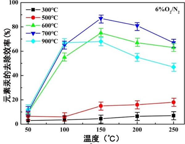 對(duì)于活性炭吸附煙氣中的元素汞。除汞測(cè)試表明,熱解溫度為700°C時(shí),活性炭的除汞效率為86%。氧氣的存在促進(jìn)了元素汞的去除。當(dāng)熱解溫度升至900°C時(shí),活性炭趨于團(tuán)聚,導(dǎo)致結(jié)晶相粒徑急劇增加,從而抑制了元素汞的去除。但在更高的熱解溫度下會(huì)增加;钚蕴康腂ET表面非常差,當(dāng)熱解溫度不高于500°C時(shí),幾乎不會(huì)產(chǎn)生鈷元素,導(dǎo)致除汞效率低。無(wú)論如何,活性炭可以用于吸附去除元素汞,而不是通過(guò)化學(xué)改性添加鈷,從而可以在燃煤煙氣中去除汞。