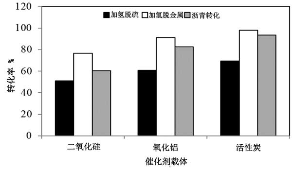 使用原油中的真空殘留物作為原料,在間歇反應(yīng)器中評估了加氫處理活性。因?yàn)樗蟹磻?yīng)都是在幾乎相同的條件下進(jìn)行的,所以轉(zhuǎn)化率的差異主要?dú)w因于所用催化劑的性質(zhì)。原料的性質(zhì)包含高瀝青質(zhì)(22%),硫(5.45%)和其它金屬含量。在圖2中,已經(jīng)提出了不同催化劑的加氫處理活性,使用活性炭,二氧化硅和氧化鋁為載體的催化劑獲得的加氫脫硫轉(zhuǎn)化率分別為70%,58%和61%。負(fù)載在氧化鋁上的催化劑具有高的加氫脫硫轉(zhuǎn)化率。