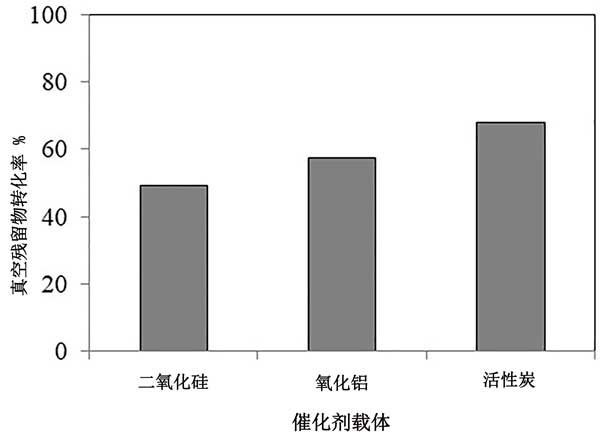使用活性炭和其它兩種催化劑研究了殘留物轉(zhuǎn)化率和產(chǎn)物分布方面的加氫裂化活性。結(jié)果示于圖3。在真空殘留物的>550℃餾分經(jīng)改質(zhì)是一種熱驅(qū)動的過程。在本研究中,發(fā)現(xiàn)催化劑之間的巨大差異表明該過程是催化控制的。就殘余物轉(zhuǎn)化而言,催化性能為:二氧化硅<氧化鋁<活性炭。