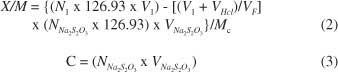 碘值根據(jù)ASTM D4607-94方法測定。碘值定義為當濾液的碘濃度為0.02N(0.02mol L -1)時,被1.0g碳吸附的碘的毫克數(shù)。該方法基于三點等溫線。標準碘溶液在特定條件下用三種不同重量的活性炭處理。實驗包括用10.0mL的5%HCl處理活性炭樣品。該混合物煮沸30秒,然后冷卻。之后不久,將100.0mL的0.1N(0.1mol L -1)碘溶液加入到混合物中并攪拌30秒。將所得的溶液過濾并50.0毫升濾液滴定用0.1N(0.1摩爾大號-1)硫代硫酸鈉,以淀粉為指示劑。每克碳吸附的碘量(X / M)相對濾液(C)中的碘濃度繪制,使用對數(shù)軸。如果殘留碘濃度(C)不在0.008-0.04 N(0.008-0.04 mol L -1)的范圍內(nèi),則每個等溫點應使用不同的碳質(zhì)量重復整個過程。對這三點應用最小二乘擬合回歸。碘值是殘留濃度(C)為0.02N(0.02mol L -1)時的 X / M值。所述X / M和C ^ 值分別由等式2和3計算。