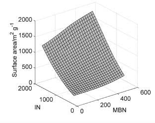 為了描述亞甲基藍和碘的數(shù)量相對于表面積的行為,使用二次模型。對于模型開發(fā),Kennard-Stone算法從105個樣本中選擇了27個樣本并用于校準。樣品表面積從199到2105 m 2 g -1不等。亞甲基藍的數(shù)量在0到501毫克克每升之間,碘值從155到1670毫克克每升。建模后獲得的表面擬合(圖1)由公式4描述。