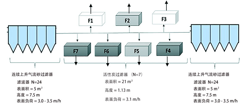 圖1:連續(xù)上流砂濾器和活性炭平行下游過濾器的示意圖。深灰色框(F4,F6和F7)是經過改造的活性炭過濾系統,淺灰色框(Rf2和Rf5)是未改造參考活性炭。存在附加過濾器(F1和F3)。