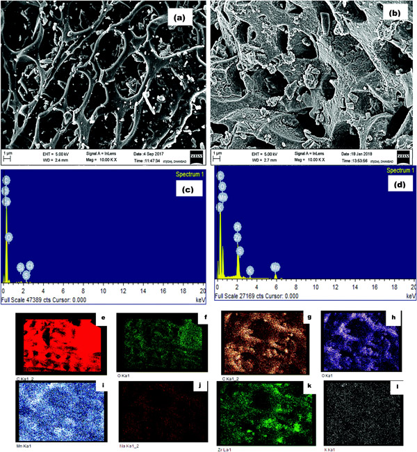 同時,EDX結(jié)果也證實了用KMnO 4和氯氧化鋯的氧化過程顯著增加了載鋯活性炭上的氧部分。元素組成結(jié)果要求Zr金屬元素在碳表面上的含浸量為14%。其他氧化元素的存在,即氧氣和錳也證實了載鋯活性炭內(nèi)在的氧化活性。在改性過程中,與未加工的活性炭相比,氧部分變成了兩倍以上,而活性炭對于應用部分則顯示出良好的征兆。因此,F(xiàn)E-SEM和EDX映射的結(jié)果聯(lián)合顯示,這種改性將原始活性炭的結(jié)構(gòu)模式改變?yōu)榫哂懈嗫椎母植诘暮醣砻妫@將有助于其應用。