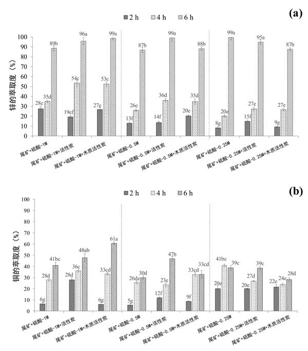 圖1:活性炭在4小時和6小時后鋅(a)和銅(b)的提取程度。
