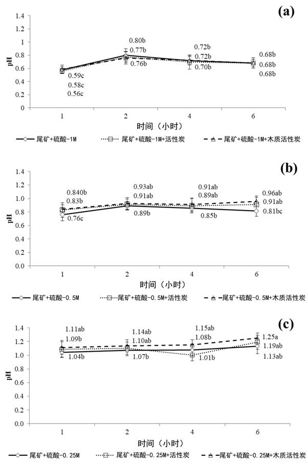 在H2SO4-1M中用活性炭和木質(zhì)活性炭處理的對照尾礦在圖2提供,(3a)中的pH變化,H2SO4-0.5M(3b)和H2SO4-0.25M(3c)浸出溶液。關(guān)于浸出實(shí)驗(yàn)期間的pH演變,盡管活性炭顯示堿性pH,但在不存在或存在活性炭的情況下觀察到小的差異。選擇硫酸作為浸出液是因?yàn)樗梢杂行У剡x擇性溶解Zn化合物而不是Pb和Ca。相反,樣品中的氧化鉛和碳酸鹽會溶解在硫酸溶液中,然后以硫酸鉛的形式沉淀。然而,當(dāng)在浸出液中加入活性炭時,氧化還原電位的下降幅度高于加入木質(zhì)活性炭后。這一事實(shí)可能與碳基材料與系統(tǒng)中存在的氧化劑種類和礦物質(zhì)之間的不同相互作用有關(guān)。事實(shí)上,觀察到在木質(zhì)活性炭催化的黃銅礦浸出過程中氧化還原電位降低,并將這種影響歸因于礦物和木質(zhì)活性炭在酸性介質(zhì)中的電偶相互作用。