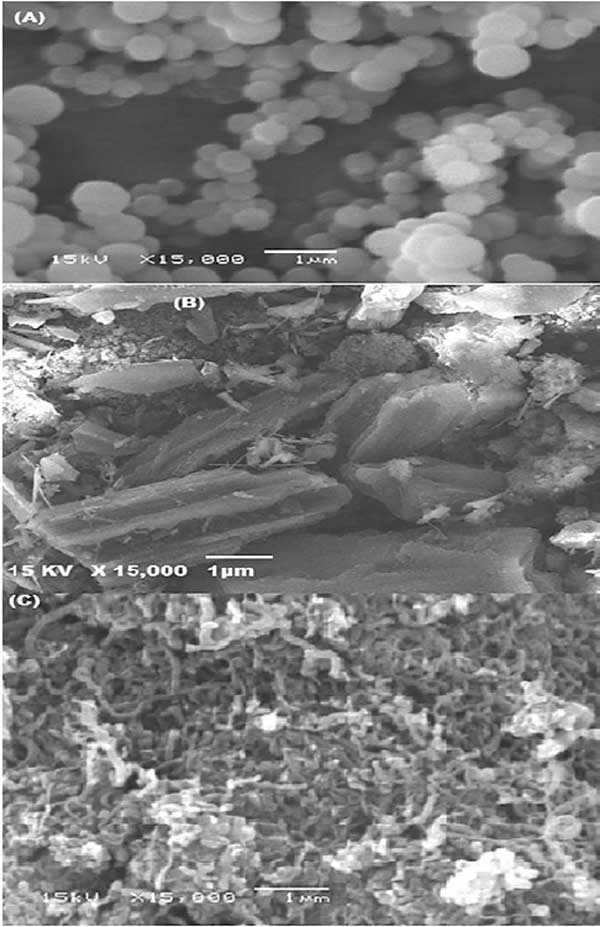 這種方法是檢查活性炭表面形態(tài)的有用方法。圖1A和1B展示了丙烯腈-共聚苯乙烯(A)和活性炭浸漬后的(B)SEM照片。這些圖顯示了球形、均勻形狀的結(jié)構(gòu),改性方法導(dǎo)致改性復(fù)合顆粒尺寸增加了7.95%。此外,圖1C顯示了制備的納米碳管的SEM圖片。該圖顯示了未處理樣品中存在無(wú)定形碳。此外,值得注意的是,這些管子又細(xì)又長(zhǎng),并且沒(méi)有大量凝聚在一起。納米碳管的管狀直徑介于75和99.25nm之間。