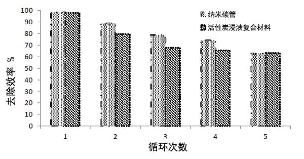 活性炭復(fù)合材料的再生具有經(jīng)濟(jì)重要性。該實(shí)驗(yàn)涉及許多吸附-解吸循環(huán),以估計(jì)重復(fù)脫色對(duì)納米材料吸附效率的影響。發(fā)現(xiàn)納米碳管和活性炭浸漬材料對(duì)活性紅的去除效率略有變化,如圖3所示。數(shù)據(jù)顯示原始納米碳管和活性炭浸漬材料存在差異與不同初始活性紅染料濃度下重復(fù)使用的納米化合物相比;钚约t的吸收程度在第一個(gè)循環(huán)后達(dá)到98.18%,然后在五輪納米碳管后降低到62.72%,而對(duì)于活性炭浸漬材料,第一個(gè)循環(huán)去除效率為97.72%,在第一個(gè)循環(huán)后,在五輪后降低到63.18%,表明其再生有效性,如圖3所示。因此,可以得出結(jié)論,納米碳管和活性炭浸漬材料的吸附過(guò)程會(huì)受到延長(zhǎng)重復(fù)使用周期的影響,而不會(huì)損失大量染料吸附能力。因此,兩種納米化合物被多次用于從水性階段去除活性紅染料。因此,這表明它們可以多次使用,證明了它們的經(jīng)濟(jì)可行性。