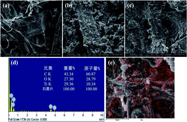 圖2:(a)原始鏡片組織(b)僅裝有活性炭的鏡片組織和(c)裝有載鈦活性炭的鏡片組織的SEM圖像。(d)載鈦活性炭的EDS光譜和(e)載鈦活性炭的EDS鈦元素映射。
