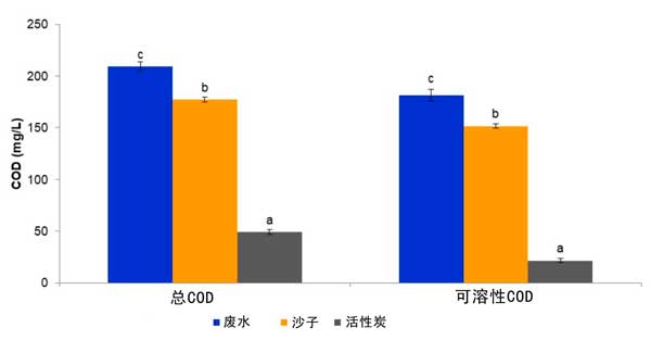 圖2:通過砂濾器和活性炭吸附柱系統(tǒng)處理經(jīng)過生物處理的含殺菌劑的流出物時(shí)的總COD濃度和可溶性COD濃度。對(duì)于每個(gè)測量參數(shù),由相同字母指定的條形在5%的水平上沒有顯著差異。