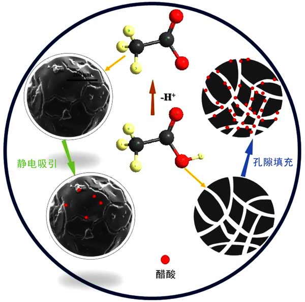 活性炭對乙酸的吸附機理如圖3所示。結(jié)合上述吸附實驗和表征結(jié)果,吸附過程可能包括多個方面。首先,活性炭在足夠多的孔隙中可以發(fā)生孔隙填充效應(yīng),從而有效地吸附乙酸。其次,活性炭和乙酸之間存在靜電引力。在較高pH的溶液中,活性炭表面具有更多的負電荷,導(dǎo)致CH3COO-與活性炭表面之間的靜電排斥更強。