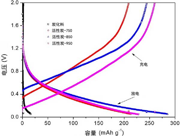 充放電曲線評估了活性炭的的電化學(xué)性能,不同溫度活化的活性炭電極如圖3所示。CD測試是在0.25C的電流密度速率下進行的;罨瘻囟忍岣吡顺潆娙萘俊;钚蕴繕悠返母叱潆娙萘繛260.36mAh/g-1,而炭化料樣品的低充電容量為1.98mAh/g-1。這是因為活化的樣品可以吸收很多的鋰離子。放電曲線顯示三個不同的電位區(qū)域,這可能歸因于不同的機制。0到0.12V的區(qū)域?qū)?yīng)于鋰離子從隨機取向的小分子堆疊中的微孔中脫出。0.12到0.8V的區(qū)域歸因于鋰離子從無序石墨烯層中脫出。高于0.8V的區(qū)域?qū)?yīng)于鋰從各種邊緣位置或石墨烯層中含H-/O官能團的脫嵌。
