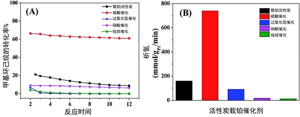 圖2:(A)甲基環(huán)己烷脫氫為甲苯的轉化曲線和(B)活性炭載鉑催化劑上的析氫直方圖。