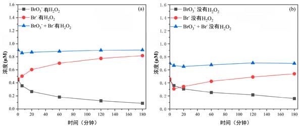 圖3:各種溴酸鹽與不存在和存在過(guò)氧化氫的情況下的濃度(a)有過(guò)氧化氫,(b)沒有過(guò)氧化氫。