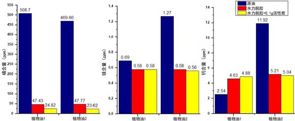 磷含量在兩個(gè)兩種植物油中主要由以所示的處理(水重量2%+活性炭0.1克)后減少圖2。植物油1的磷含量降低了大約95.22%,而植物油2的磷含量降低了大約相同的值(94.98%)。油液經(jīng)水脫膠后Mg、Ca含量略有下降,而Ca處理后略有升高。這一結(jié)果可能是由于在處理過程中活性炭中存在一些Ca解離回油相;钚蕴繉α缀康拇罅拷档褪怯捎贜aOH改性的活性炭具有極性、帶正電荷的表面。由于存在芳環(huán)簇和固有缺陷,它還具有磁力。在脫膠過程中將活性炭添加到植物油和水中時(shí),活性炭的芳環(huán)簇中的離域電子產(chǎn)生磁矩,強(qiáng)烈誘導(dǎo)磷脂磷酸頭部周圍的順磁性氧。同時(shí),活性炭的極性/親水性也允許與極性水分子相互作用。水分子也被磁場激活,從而發(fā)生氫自旋從旁水到鄰水的重新定向,從而降低水的抗磁性;钚蕴空T導(dǎo)的這種磁場會(huì)導(dǎo)致表面張力降低,削弱水分子的分子內(nèi)能。結(jié)果,更多的水分子被分解成H+離子和OH-離子,促進(jìn)更多水解反應(yīng)。這些現(xiàn)象與其他力量相結(jié)合:熱能和離心也會(huì)引發(fā)磷脂分子內(nèi)的鍵斷裂,導(dǎo)致磷酸頭部基團(tuán)從磷脂分子上分離(脫磷脂)。
