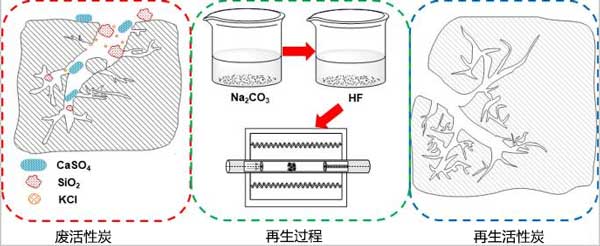 活性炭在燒結(jié)煙氣處理后的再生,采用了Na2CO3溶液、HF溶液和CO2的新型連續(xù)處理方法可以有效地從燒結(jié)煙氣凈化過程中再生廢活性炭。無機化合物如CaSO4和SiO2以及KCl的沉積導(dǎo)致活性炭失活,Na2CO3溶液可以將CaSO4轉(zhuǎn)化為CaCO3并去除水溶性化合物,如KCl。硫轉(zhuǎn)化率首先顯著增加,然后隨著Na2CO3濃度的增加變化減慢。當(dāng)Na2CO3濃度為0.5mol/L時,硫轉(zhuǎn)化率自由基高達(dá)94.6%。另外在各種溶劑濃度和溫度都達(dá)到較好的水平,總體再生效率可達(dá)111%