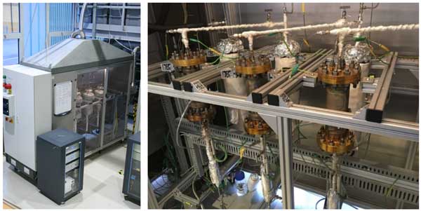 圖1:實(shí)驗(yàn)室規(guī)模的甲烷化試驗(yàn)臺(左),反應(yīng)器和熱交換器(右)。