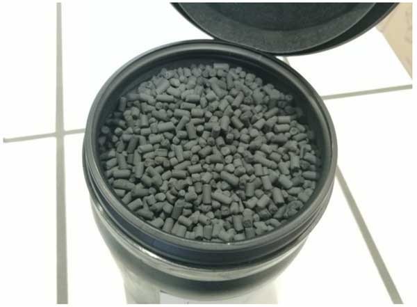 根據(jù)直接使用瓶裝真實(shí)氣體所獲得的結(jié)果,包括列出的催化劑毒物,這會導(dǎo)致催化劑快速降解,因此在第一個反應(yīng)器的上游安裝了活性炭過濾器。為此,將金屬氧化物浸漬的活性炭顆粒添加到氣體混合站。這些顆粒專門開發(fā)用于從缺氧氣流(例如CO2、N2、CO和H2)中去除硫化氫、有機(jī)硫醇、二氧化硫、硫化羰和氮氧化物。它們的銅含量為7%(以CuO計),直徑為3mm,長度為7mm(圖3)。將總共約300毫升的這些顆粒活性炭加入氣體混合站。