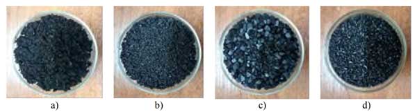 圖2:作為過濾介質(zhì)的吸附劑,a-果殼活性炭,b-煤質(zhì)活性炭,c-木質(zhì)活性炭,d-椰殼活性炭。