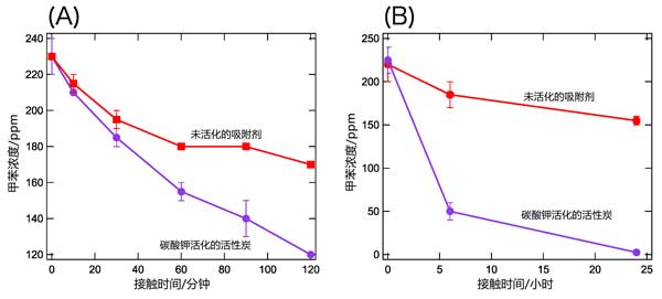 為了研究在此處使用的條件下K2CO3活化的活性炭是否可以完全去除甲苯,觀察甲苯濃度24小時。圖3b顯示了24小時觀察期間甲苯濃度與時間的關(guān)系;钚蕴匡@然能夠從空氣中吸附大量氣態(tài)甲苯。吸附24小時后的最終甲苯濃度非常低,僅檢測到痕量的甲苯。相比之下,當(dāng)使用未活化的吸附劑時,即使在吸附24小時后,仍有相當(dāng)數(shù)量的甲苯(160ppm)。