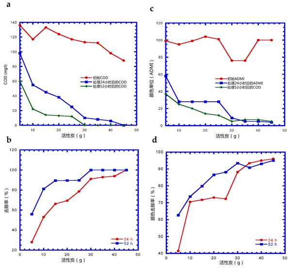 不同活性炭用量在24和54小時(shí)后COD和ADMI的變化如圖2所示。在初始COD濃度為88-136mg/L的情況下,分別通過(guò)吸附染料廢水24和52小時(shí)來(lái)完全去除COD需要45和30g的活性炭用量(圖2ab)。ADMI的降低和去除趨勢(shì)隨活性炭用量24和52小時(shí)的變化與COD變化相似(圖2)。ADMI隨著活性炭用量的增加而降低;钚蕴课24小時(shí)和52小時(shí)后,殘留ADMI分別為4-5和5-7。隨著活性炭用量≥30g,ADMI的去除效率從88-96%提高到90-95%。