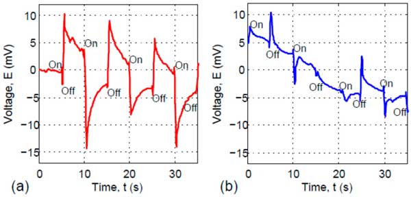 圖2:含鈦酸鈷(II)顆粒的復(fù)合活性炭(a)和含二氧化鈦顆粒的復(fù)合碳纖維(b)的開路電壓。