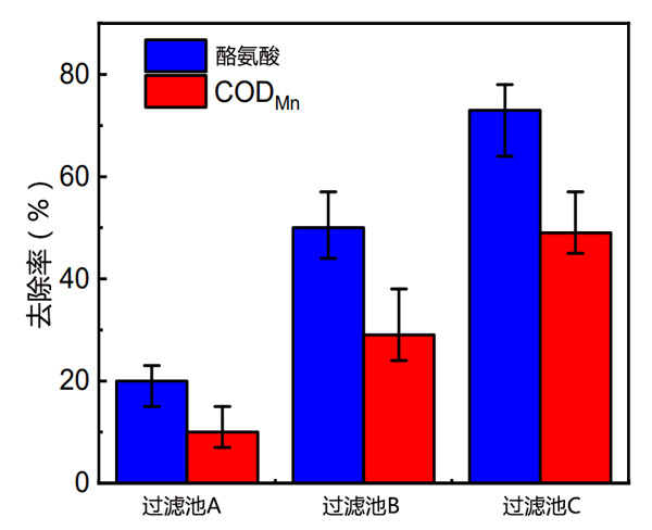 活性炭濾池出水二氯乙腈前體酪氨酸和CODMn的平均去除率如圖2所示。實(shí)驗(yàn)過(guò)程中,三個(gè)活性炭過(guò)濾器出水酪氨酸濃度依次下降:過(guò)濾器C(73%)>過(guò)濾器B(50%)>過(guò)濾器A(20%)(p<0.05)。生物濾池出水的酪氨酸濃度低于進(jìn)水。誰(shuí)記錄了飲用水處理廠生物過(guò)濾后出水中DON濃度的增加,表明DON總體出水濃度的變化并不代表個(gè)體的變化,而是過(guò)濾器中不同個(gè)體的變化規(guī)律也不同。平均出水CODMn去除率的變化趨勢(shì)與平均出水酪氨酸去除率一致。CODMn去除率可以反映生物濾池中有機(jī)物的去除情況。酪氨酸是一種有機(jī)物,其分子結(jié)構(gòu)中含有還原性酚羥基和氨基,可被高錳酸鉀氧化。因此,CODMn去除率也可以作為酪氨酸去除的依據(jù)。