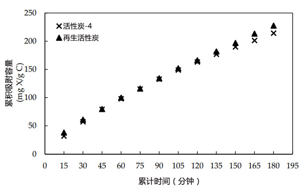 活性炭具有一定的吸附能力。隨著越來越多的成分被吸附在其表面上,吸附能力會隨著時間的推移而降低。一旦達(dá)到最大吸附容量,就不能再有效使用。對于活性炭樣品的再生,吸附的成分可以通過加熱破壞。在這部分研究中,在其表面吸附黃原酸鹽的廢活性炭樣品通過在550℃下加熱1小時進(jìn)行再生。圖2比較了初始活性炭和再生活性炭樣品的吸附性能。再生活性炭和活性炭樣品的累積吸附黃藥量相差不大。結(jié)果表明,吸附在用過的活性炭上的黃藥被破壞了,它被有效地恢復(fù)并可以重復(fù)使用。