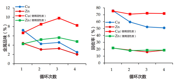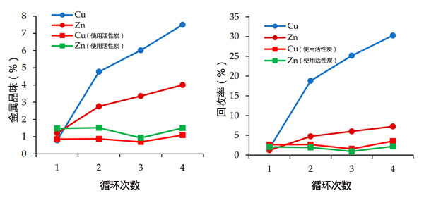 圖4:使用活性炭和不使用活性炭進(jìn)行水處理時,Cu和Zn的品位和對粗銅精礦的回收率。