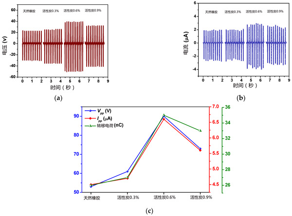 圖2:(a)輸出電壓,(b)輸出電流,和(c)橡膠和活性炭含量0.3、0.6和0.9%的復(fù)合材料的轉(zhuǎn)移電荷。