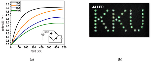 圖3:(a)由活性炭制造的摩擦納米發(fā)電機(jī)產(chǎn)生的電力充電的電容器的充電電壓曲線(b)發(fā)電機(jī)電輸出可瞬間點(diǎn)亮44個(gè)綠色LED。