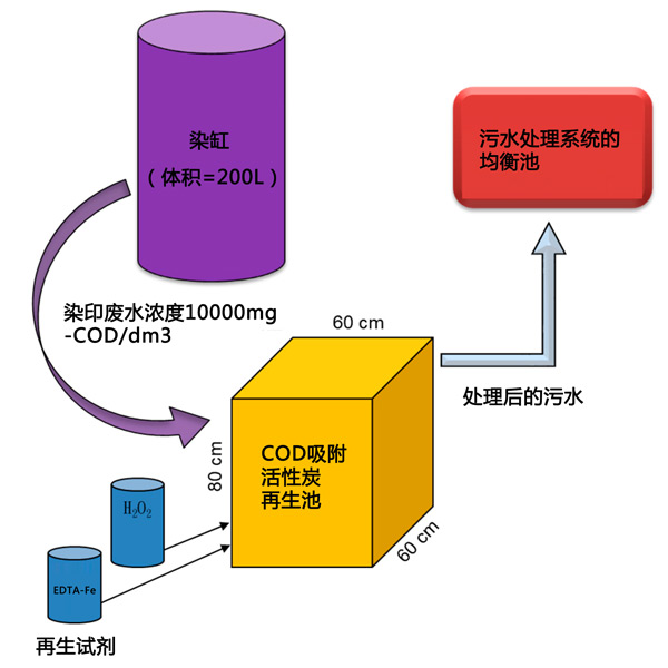根據(jù)獲得的數(shù)據(jù)和當(dāng)前的紗線染色工藝,使用所提出的兩步處理系統(tǒng)處理來自常用的200L染浴的高COD染色廢水看起來適用,并提出了建議如圖3所示。據(jù)我們所知,目前運營的染色設(shè)施中沒有這種建議的設(shè)置。設(shè)計容積(即200L)足以容納一批染缸出水,使高COD廢水可直接進入擬建裝置的吸附和再生。根據(jù)結(jié)果,去除50-60%的COD將大大減少回流到平衡罐的COD,從而避免現(xiàn)有廠內(nèi)生物處理單元的過載情況。為了運行所提議的裝置,首先,將來自染色池的一定量的高COD廢水引導(dǎo)至充滿指定活性炭的反應(yīng)單元(如果處理120L廢水,則為20kg)進行24小時吸附。由于結(jié)果表明染浴出水COD在酸性pH值下吸附更多,二是對處理后的廢水進行篩分,24小時后排至其廢水處理設(shè)施的頭部(即平衡池)。第三,分別串聯(lián)添加初始濃度為2.12mmol/dm3和2.5%的乙二胺四乙酸鐵鈉和過氧化氫,以啟動活性炭再生1小時。從連續(xù)運行來看,兩步法處理高COD染色廢水的應(yīng)用前景看好。然而,我們確實注意到該技術(shù)的當(dāng)前應(yīng)用可能僅限于染浴設(shè)計及其操作。染浴的高COD流出物發(fā)生在染色過程的第一次排放,但對于大多數(shù)可用的染浴操作,根據(jù)不同的COD濃度對每批流出物進行分離是不適用的。一些染色裝置或染色工藝的改造被認(rèn)為是必要的。