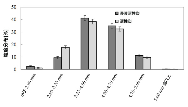 在一系列實(shí)驗(yàn)中使用了用碘酸和無機(jī)酸浸漬的顆;钚蕴俊8鶕(jù)測(cè)量粒度分布、堆積密度和甲苯吸附能力,和測(cè)量浸漬活性炭的pH值。粒度按篩子大小分類。通過測(cè)量包裝在200mL容器中的浸漬活性炭的重量來計(jì)算堆積密度。通過將1/10甲苯蒸氣流到10g浸漬活性炭中,測(cè)量甲苯蒸氣吸附前后的重量差,計(jì)算出甲苯吸附容量。將3g浸漬活性炭加入300mL離子交換水中并搖動(dòng)30分鐘,制成活性炭樣品再進(jìn)行pH測(cè)量。圖1顯示了浸漬活性炭和活性炭的粒度分布。對(duì)于浸漬活性炭和活性炭,粒徑均為2.80-5.60毫米。這些粒徑通常是氣體處理的值。通過浸漬,堆積密度增加,甲苯吸附能力降低。這可能是由于浸漬材料滲入了孔隙。由于金屬的雜質(zhì),活性炭的pH值呈堿性。由于酸解離,通過浸漬降低了pH值。